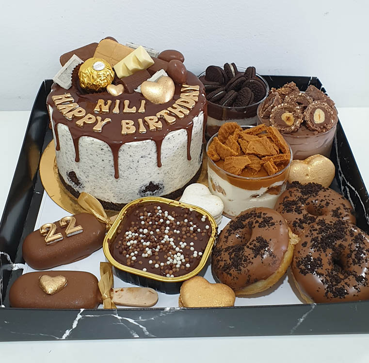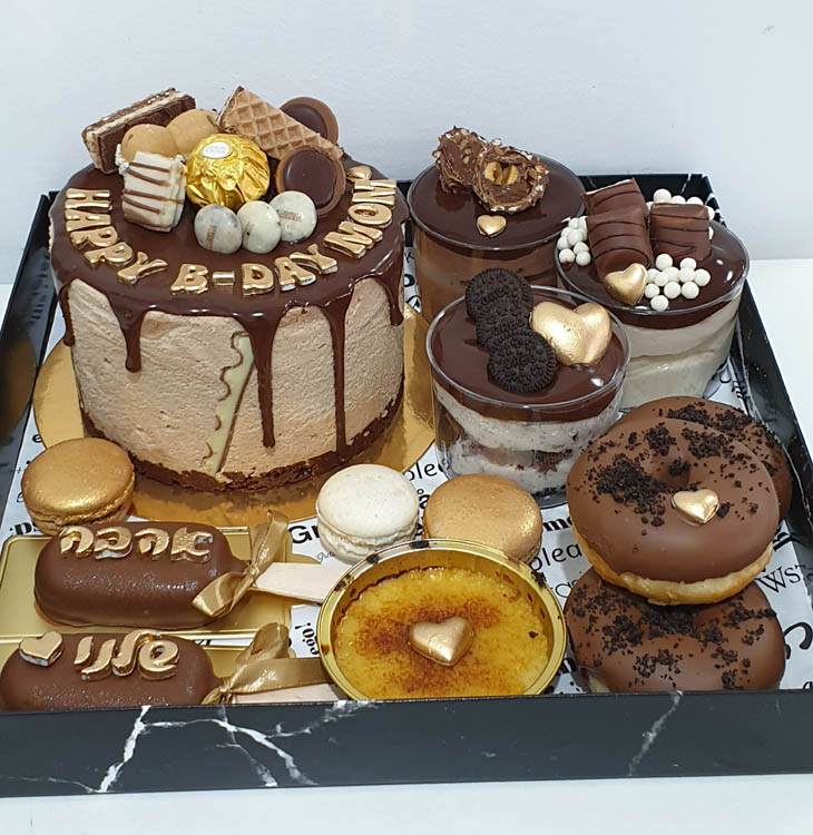 מארז עם עוגת מוס קוטר 14, 3 צנצנות קינוח, 2 מגנום, דונאטס ונמסיס/קרם ברולה